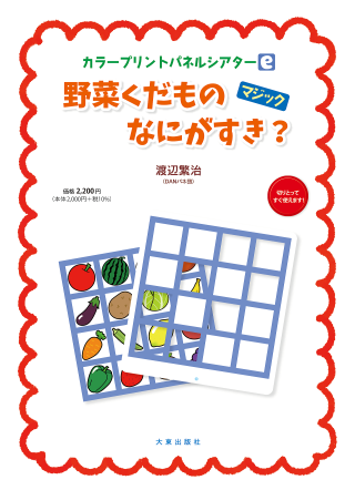 16種類の野菜とくだものの中から、選んでもらった1つのものをピッタリ言い当てるマジックパネルシアターです。4つワクを使って4つの質問に答えてもらうと・・・あら不思議!? 選んだものだけがワクの中に浮かび上がります。子どもたちも大興奮の不思議な不思議な作品です。